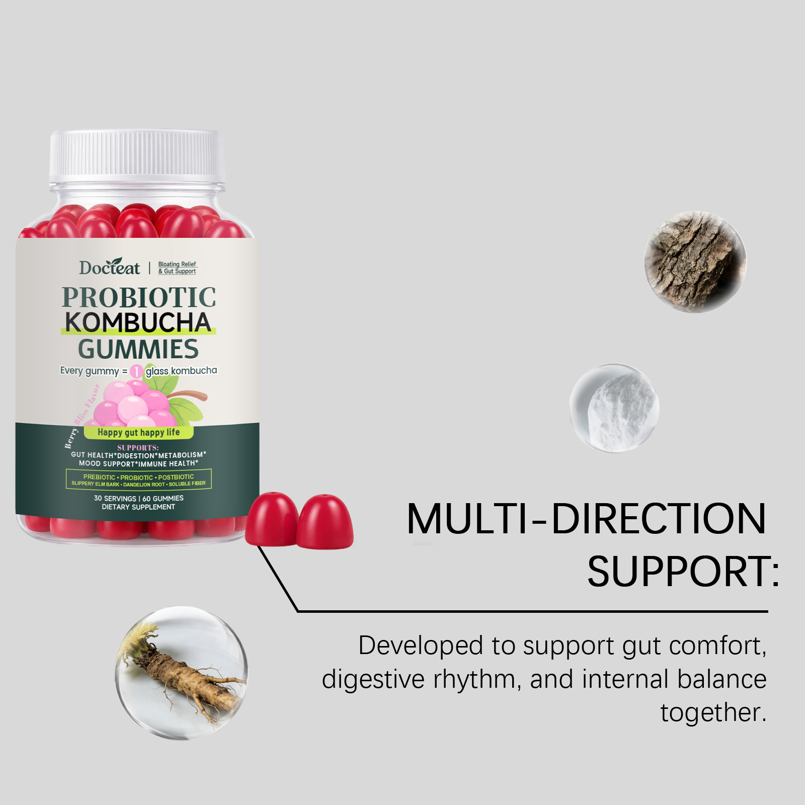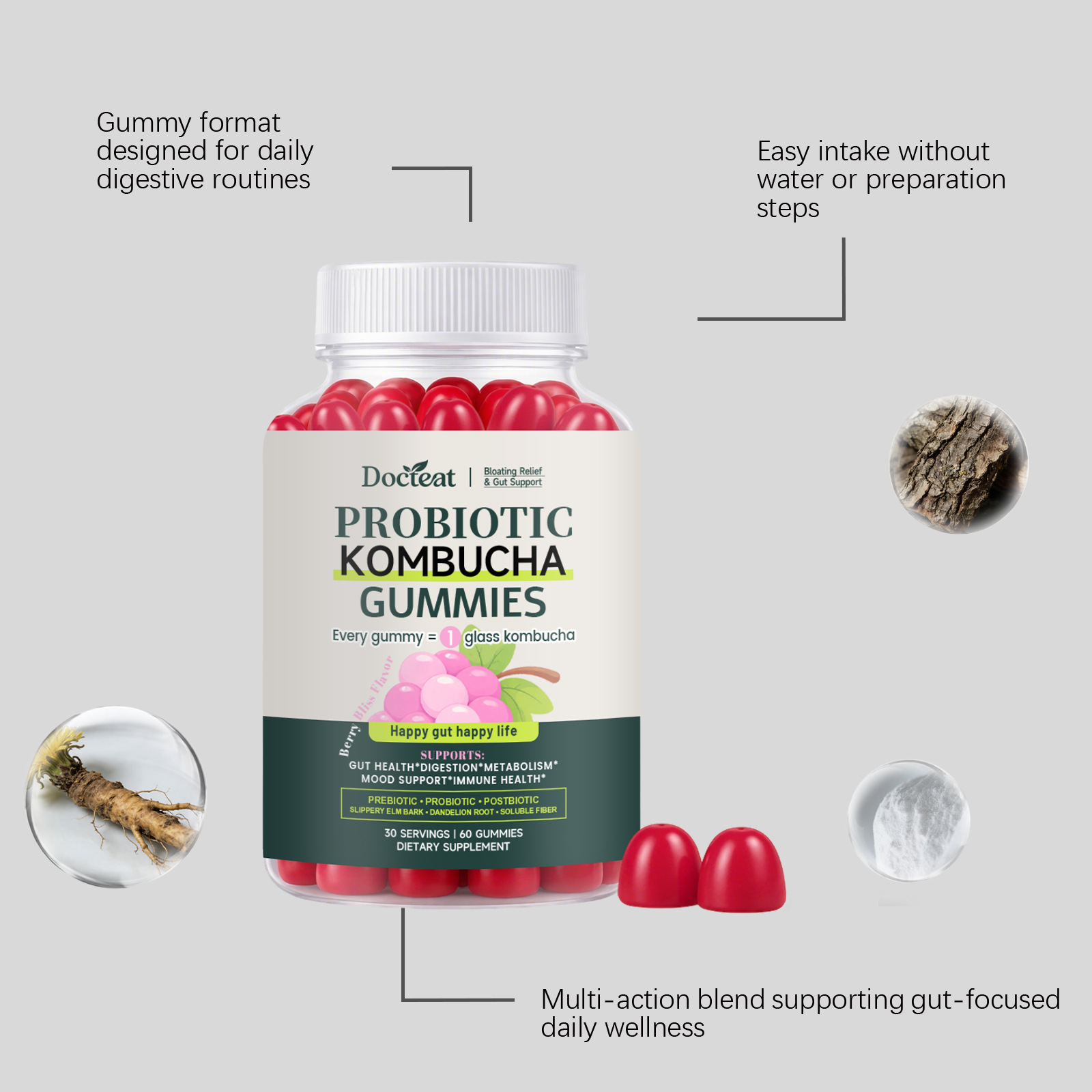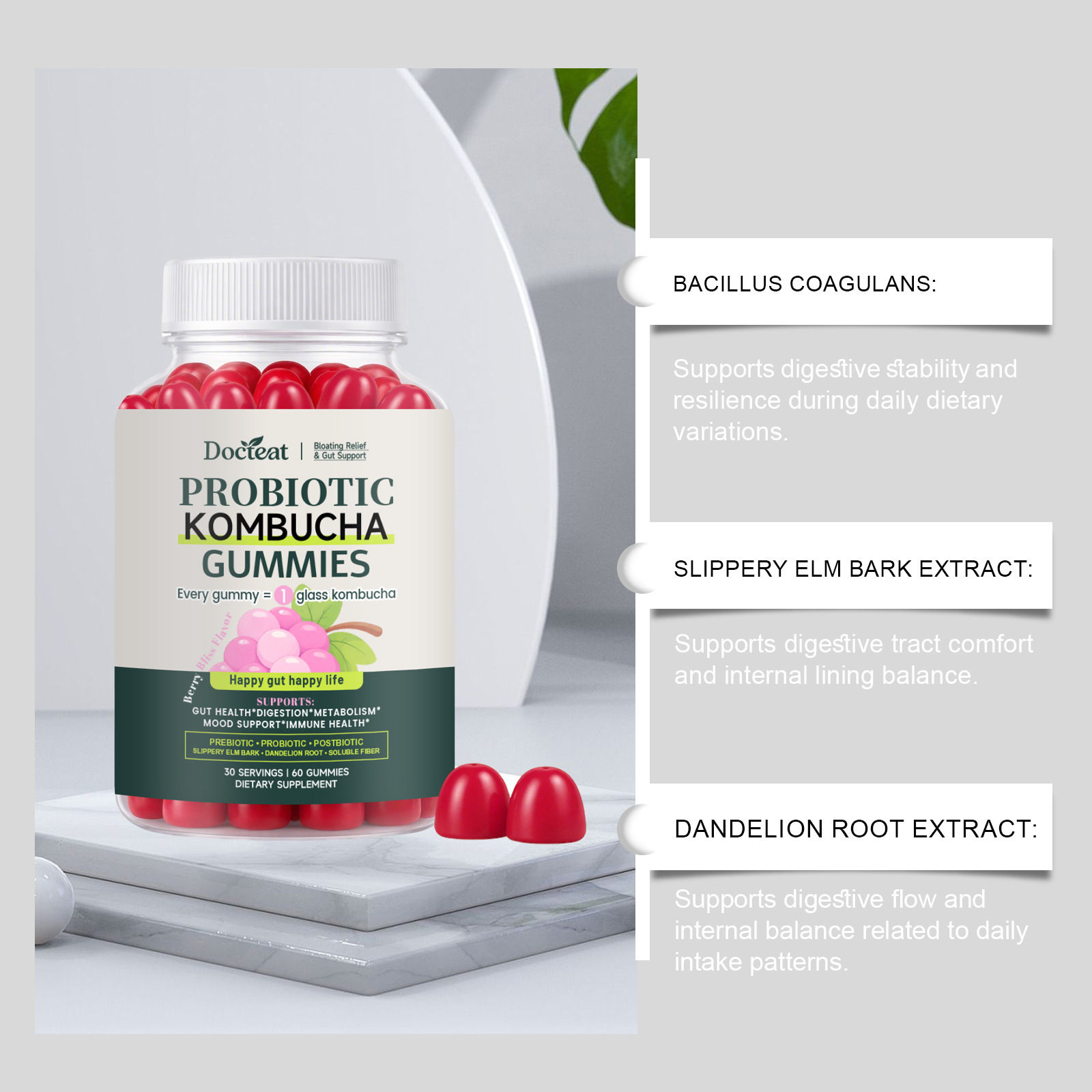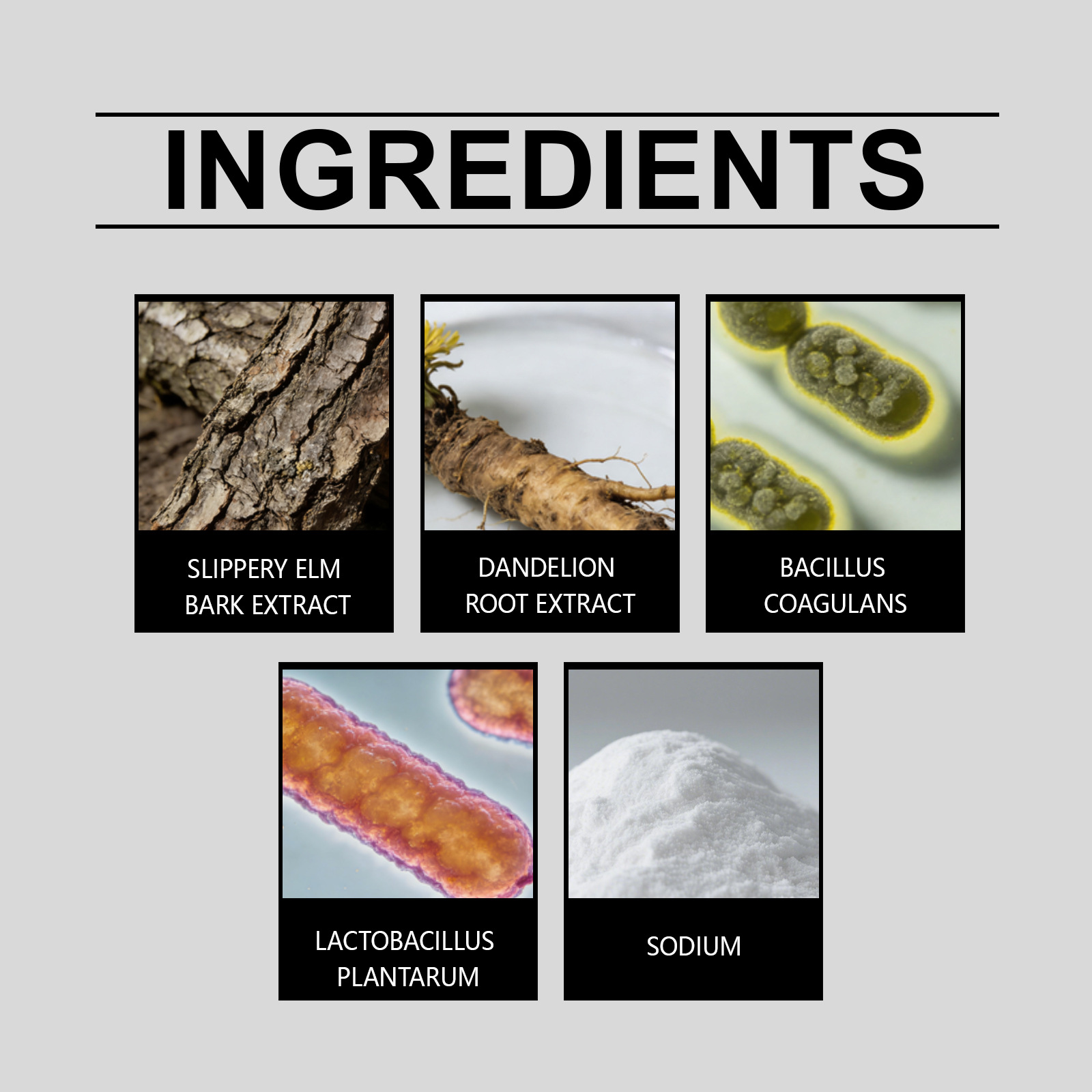 Ingredients: sodium, lactobacillus plantarum, elm bark extract, dandelion root extract, Bacillus coagulans.